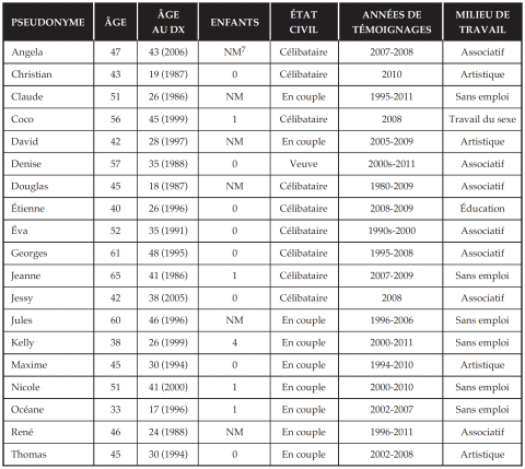 En revanche, les personnes interviewées possèdent une solide expérience de témoignages dans des contextes très variés : imprimé, audiovisuel, art vivant, internet, radio, danse, conférences en milieu scolaire et autres lieux publics. Ils ont raconté leur histoire au cours des vingt dernières années, de 1996 à 2011, dans des médias journalistiques et non journalistiques (tels que les œuvres artistiques et la fiction) et lors de rencontres collectives. Un répondant avait quatre expériences de témoignage alors que certains en avaient des centaines. Outre le fait de témoigner, plusieurs répondants travaillaient dans le milieu associatif, artistique, en éducation et dans l’industrie du sexe. Six répondants étaient sans emploi au moment de l’entrevue. Chaque entrevue, d’une durée d’environ deux heures, a abordé trois thèmes : l’expérience de la révélation publique du statut sérologique, le processus qui amène une personne à témoigner dans un média et les répercussions perçues du témoignage à court et à long terme.
