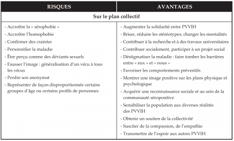 Bien que, globalement, les personnes témoins aient énuméré plus d’avantages que de risques à témoigner de leur vécu séropositif, les risques prennent énormément de place dans la perception des répondants. L’anonymat, la responsabilité du porte-parole et la reconduction possible des préjugés néfastes les préoccupent beaucoup.